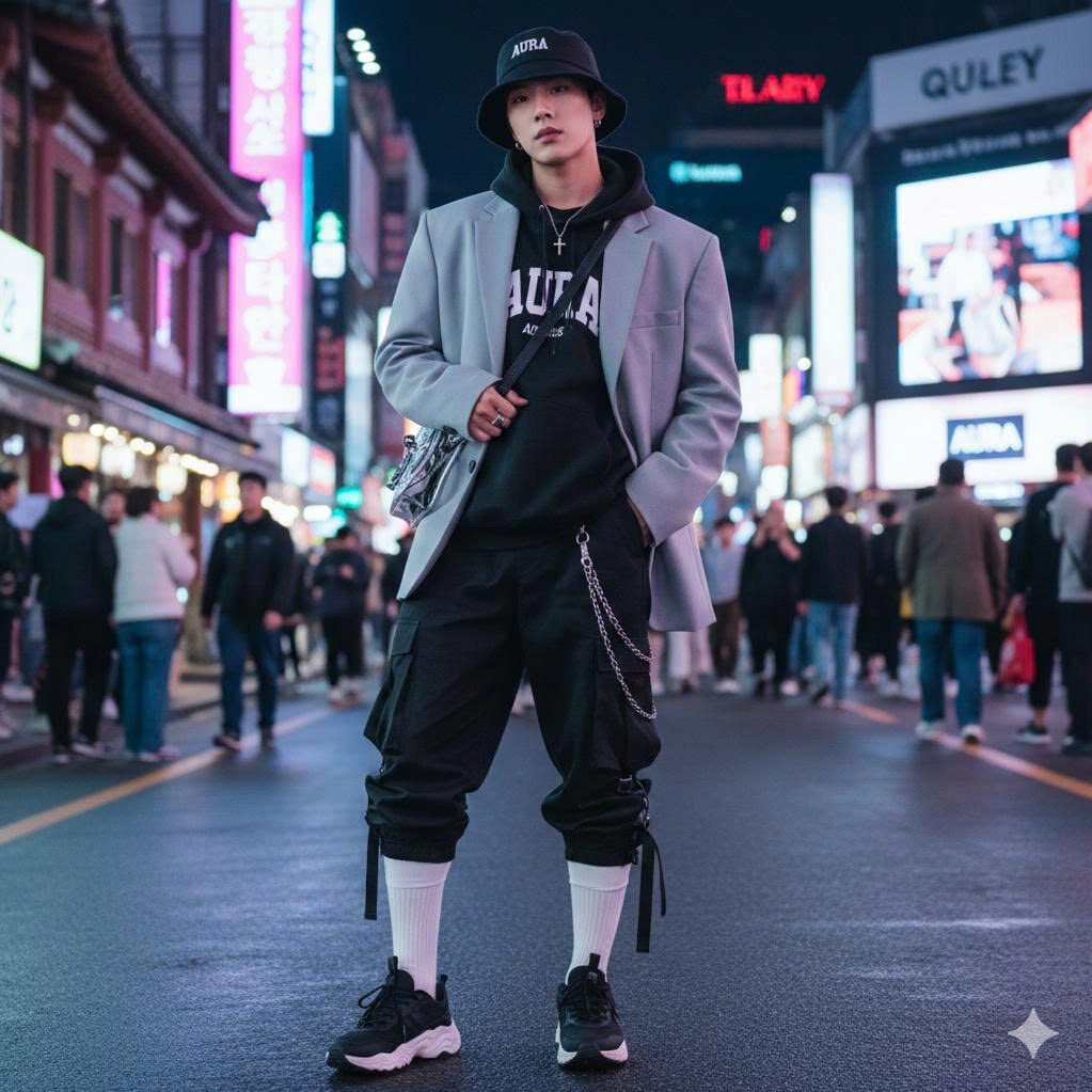 Streetwear đang trở thành xu hướng thời trang nổi bật nhờ sự kết hợp giữa năng động – cá tính – thoải mái. Set đồ trong hình mang đậm chất street style khi phối nhiều layer nhưng vẫn giữ được sự gọn gàng và thời thượng.